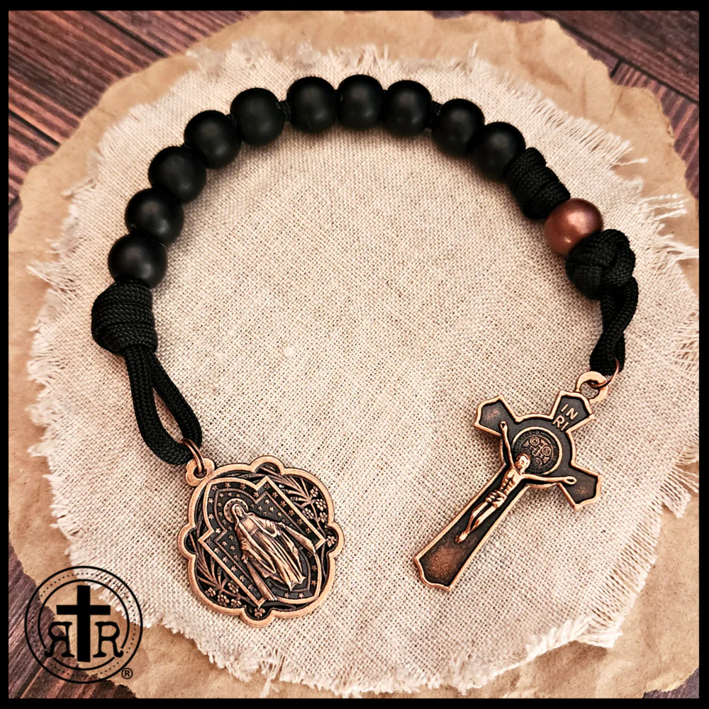 What a lovely Miraculous Medal of Our Lady on this stunning new one decade rosary from the Rugged Rosaries studio. This captivating pocket rosary slips easily into a pocket or purse, or is made to be looped onto your backpack or steering wheel. It is so convenient to keep Our Lord and Our Lady close at hand. An heirloom-quality gift of faith, perfect for a Confirmation, or any special occasion.