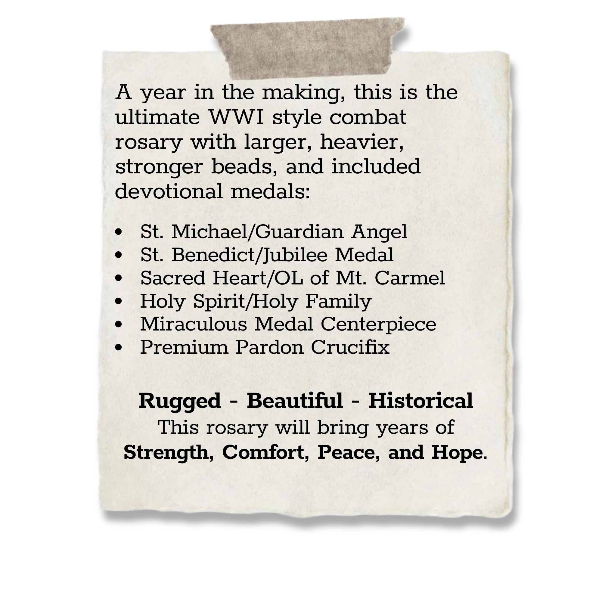 This compact all-metal rosary is rugged, functional, and portable. It has a meaningful history, as it is heavily inspired by the service combat rosaries issued by the government to soldiers, sailors, and flying aces during WWI. This new ultimate edition of the WWI Battle Beads collection features larger, heavier beads and sacred devotional Our Father medals. These beads have a wonderful heavier feel that you will love to pray with.